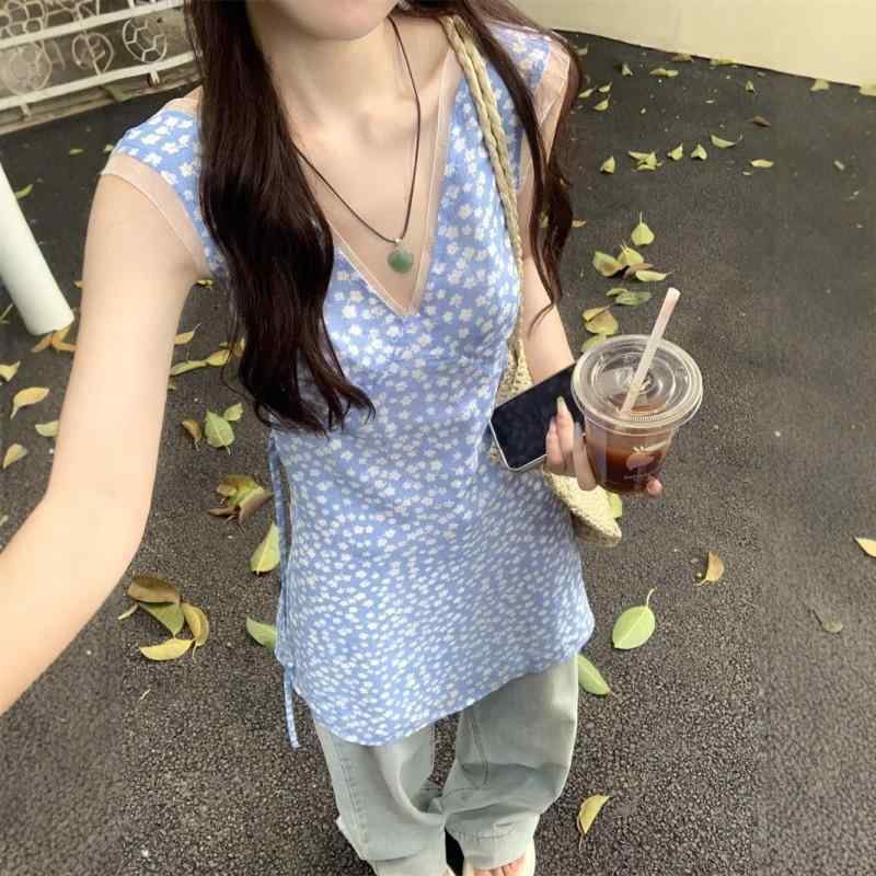 ワンピース レディース ノースリーブ Vネック ブルー 花柄 Aライン ミニ丈 膝上 ポリエステル 韓国風 カジュアル かわいい フェミニン リゾート 旅行 お出かけ