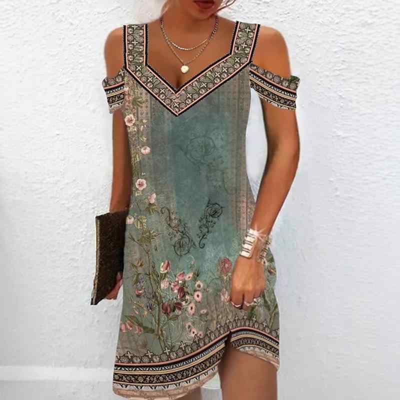 ワンピース レディース ノースリーブ Aライン 膝上丈 ポリエステル 高腰 プリント Uネック カジュアル 通勤 エレガント 欧美風