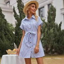 ワンピース レディース 半袖 ストライプ柄 Aライン 膝上丈 ポリエステル 開襟シャツワンピース ベルト付き カジュアル 通勤 ブラック グリーン レッド イエロー ブルー 春夏