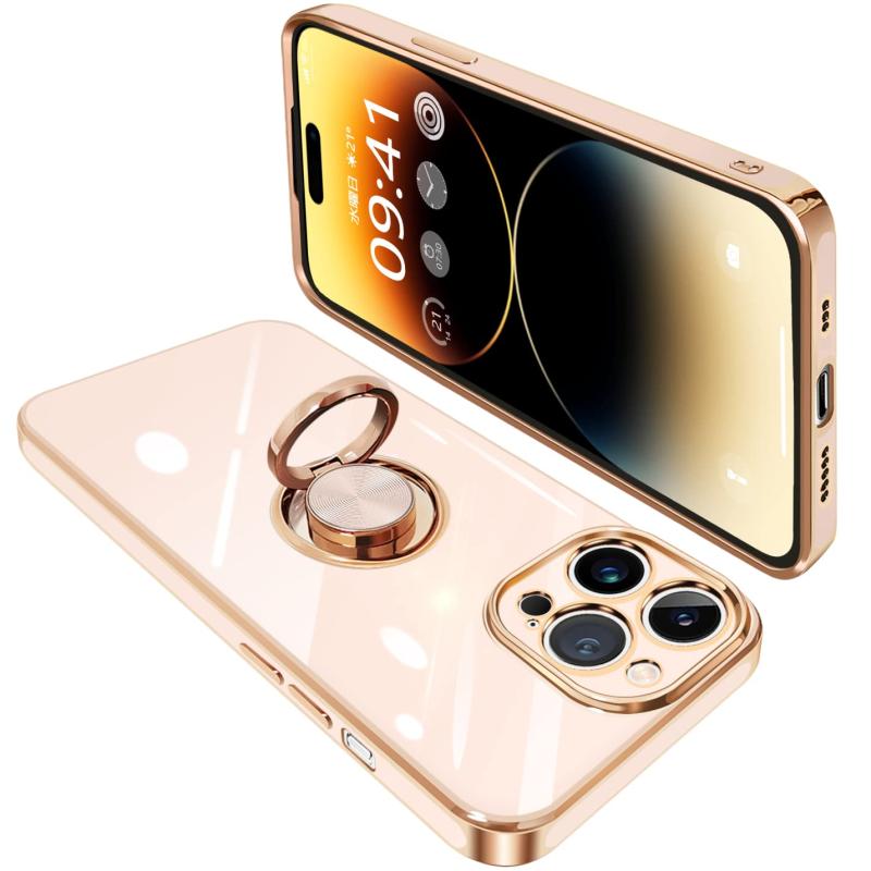 iPhone14 Pro Max ケース リング付き アイフォン14ProMax リング カバー 耐衝撃 TPU 360°回転 スタンド機能 メッキ加工 車載ホルダー ストラップホール付き 6.7インチ(ピンク)