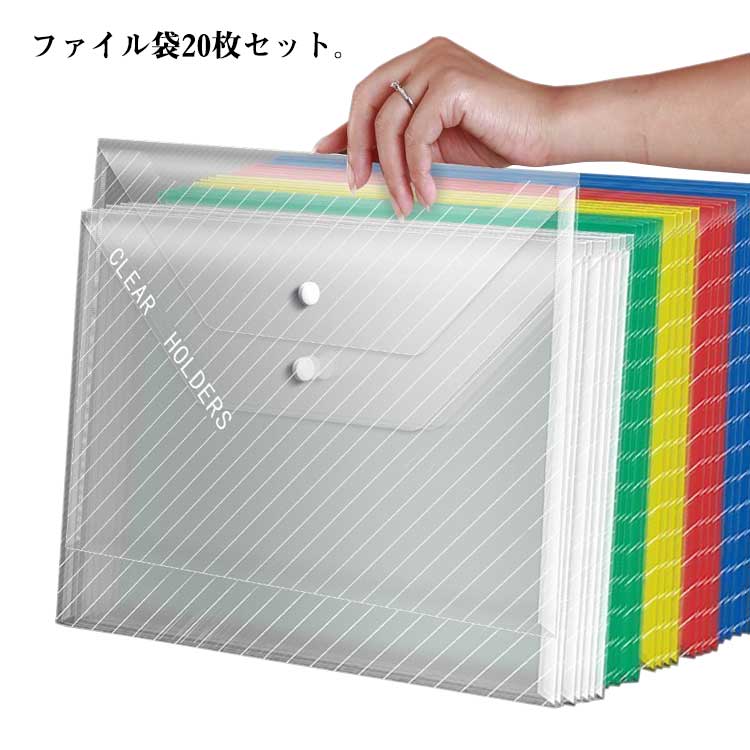 ファイル袋 ボタン式 20枚セット A4 ファイルバッグ クリア ファイルケース ファイルホルダー 撥水 大容量 ドキュメントバッグ 収納袋 ファイル収納 カラフル おしゃれ 文房具収納 書類整理 資料ケース 学校 オフィス用品 出張 旅行 送料無料