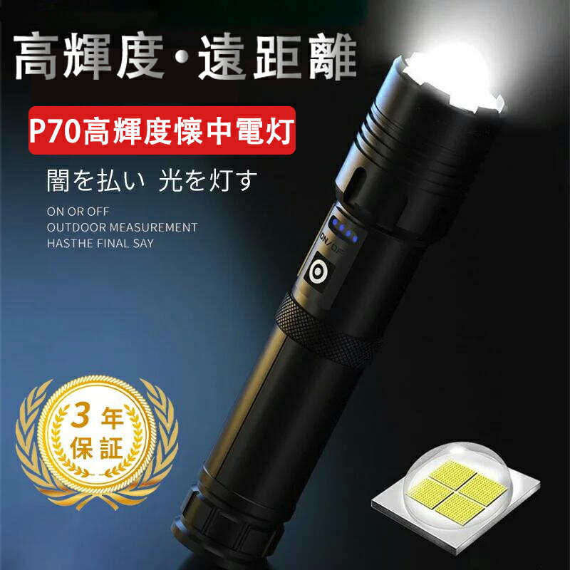 ●【最新XHP160超高輝度LED】懐中電灯は最新のアップグレードされたledライトチップを搭載するので,懐中電灯は高い出力と強力な集光能力を発揮します,暗闇でも広範囲を明るく照らし出すことができます。この懐中電灯は最大10000ルーメンと日常生活で使用するには十分な明るさを持ち、充電式で長時間のご利用が可能となっています。 ●【Type-C充電式ledライト&実用点灯最大16時間】この電池式懐中電灯はUSB-Cケーブルを使用するので、より便利に充電できます。付属の充電池は5000mAhの超大容量で通常のスマホを最大1.2回充電可能です。総寿命は約100,000時間で、循環充電が可能な大容量26650電池が付属して、フル充電の場合、最小モードで約16時間の連続使用ができ、最大モードでも約4時間の連続使用ができます。 ●【5モード調光+長押し2秒で自動消灯】強力なled懐中電灯は5つの明るさモード:高→中→省エネ→点滅→SOS。用途に応じてモードを変えられるので、とても便利です。アップグレード版スイッチの設計は従来の消灯不便を回避したので、任意モードスイッチを長押すだけで、すばやく照明をオフにできます。オフにするためにすべてのモードを循環する必要がある他の日本製懐中電灯よりも操作する方が便利です。懐中電灯のヘッド部分はを回して、ズーム機能が可能です。光束を広くから狭くして、最大500メートル遠くの物体に焦点を合わせます。拡大して180度広い物体領域を照らすこともできます。 夜間照明、犬の散歩、ハイキング、釣り、停電、地震、災害緊急対策などの緊急時の使用に非常に適しています。の散歩、ハイキング、釣り、停電、地震、災害緊急対策などの緊急時の使用に非常に適しています。 ●【IPX7防水&耐衝撃性&防災】IPX7全密封防護設計雨や雪の日でも正常に使用できます(水に浸さないでください)。アルミニウム合金表面が陽極酸化処理されており、耐腐食性や摩耗性に強く、優れた耐衝撃性を備えていています,より長くご使用いただけます。シャープなギザギザ状のアルミニウム製の蓮の花の攻撃ヘッドを採用して、ガラスを簡単に粉砕でき、必要な時に脱出に使えます。夜間のペットの散歩、防犯監視、夜釣り、キャンプ、登山、アウトドア、停電時、非常灯など様々なシーンでご使用いただけます。 【購入希望の方は必ずお読みください】 ●当商品はアマゾン倉庫などの委託倉庫から発送させて頂く可能性がございます。 ●委託倉庫から発送の為、注文確定後の注文内容の変更は対応しかねます。 ●当商品は配送時間指定不可です。 ●他の商品との同時注文は受けられないことを予めご了承ください。 ●こちらの商品はいかなる理由があっても、良品返品は承りません。万が一初期不良があった場合は、当店までご連絡ください。不良品の場合は直ちに交換または返品返金対応をいたします。 以上、あらかじめご了承ください。