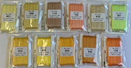 刺繍用リボン サイズ 3.5mm巾×5m ※巾は生産時の仕上げにより多少前後する場合があります。ご了承ください。 色 Col.102 Col.114 Col.124 Col.386 Col.391 Col.401 Col.409 Col.424 Col.429 Col.445 Col.470 素材 ポリエステル 100% ゆうパケット (メール便) 発送可能最大数 約48個 ※No.1541のみの場合の目安です ※別種類の刺繍リボンとの組み合わせてご購入の場合はより少ない数量の目安をご参考ください →商品の組み合わせや数量の配分によりましては発送可能な個数が大きく異なることもあります ※ゆうパケット(メール便)での発送可能な数量でも合計金額が高額などの理由で宅配便へ変更させていただく場合がございます。 その際はご了承ください。 ご注意 お客様の画面上と実物では多少色具合が異なって見える場合もございます。ご了承ください。 *表示単価は1巻(5m)単位です。 *ご注文例 ご希望カラーをご選択後にご希望数量に変更しお買い物かごへお入れください。 2巻→数量:2 5巻→数量:5 ※複数色ご希望の方は1色ずつお買い物かごへお入れください カラーは全部で78色 うすピンク系・白系・グレー・黒 はこちら ピンク系・赤系 はこちら 青系・むらさき系 はこちら みどり系・茶系 はこちら リボン刺繍用の刺繍針の販売もございます リボン刺繍針はこちら