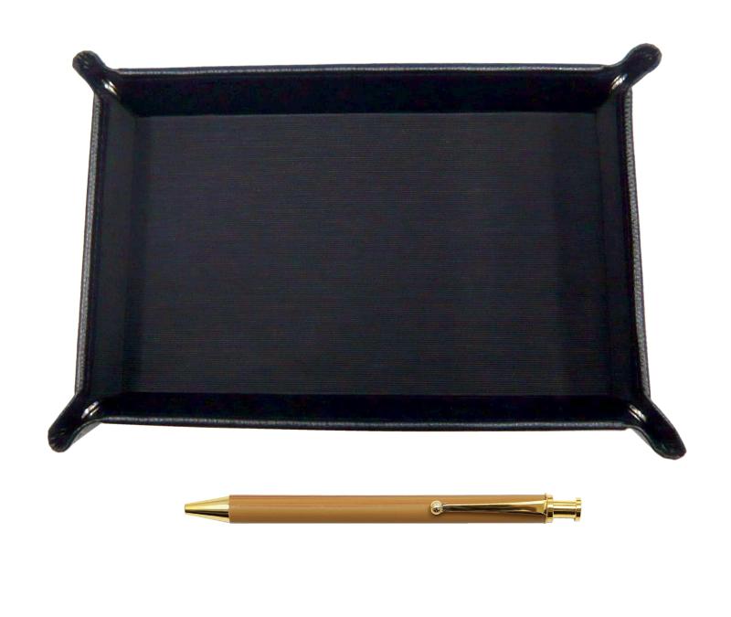 日本製シボ牛革ペントレイ黒 竹柄ボールペンセット TRASB-FB300CB日本製のシボ牛革ペントレイと竹柄ボールペンのセットペントレイ(黒) 材質:内側布貼り、外側牛革 サイズ:185mm×125mm×30mmペン 材質:樹脂 サイズ:全長132mm×軸径9.5mm