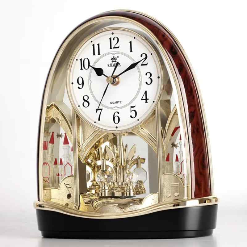 クォーツ アンティーク調 置き時計, 城のデザイン, ゴールド装飾付き, 23.4cm x 11.7cm x 25.9cm, 木目調ワインレッド枠デザイン性: アンティーク調の優雅な城のモチーフと回転する装飾が施された美しい置時計で、インテリアのアクセントとして最適です高級感: ゴールドの装飾と木目調ワインレッド枠が上品な雰囲気を演出し、リビングや寝室に華やかさを添えますサイズ仕様: コンパクトな設計で、幅23.4cm x 奥行11.7cm x 高さ25.9cmのサイズです機能性: 見やすい文字盤と正確な時を刻むクォーツムーブメントを採用しています装飾デザイン: 側面には城と音符のモチーフが描かれ、中央には回転する金色の装飾が施されています