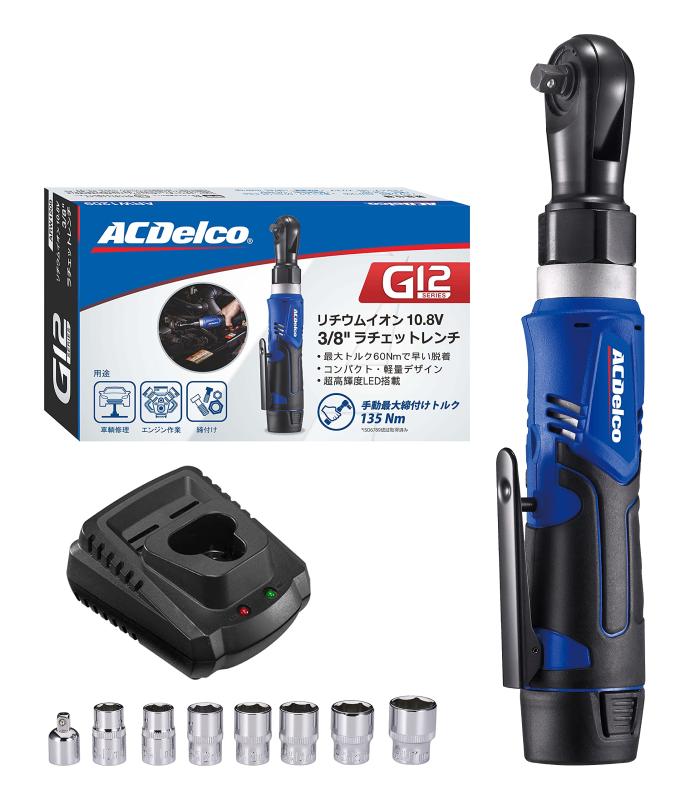 ACDelco G12 10.8V 充電式 ラチェットレンチ 3/8”(9.53mm) 最大トルク45ft-lbs(60Nm) 正逆転切替 LEDライト内蔵(ソケット.付)A1209P