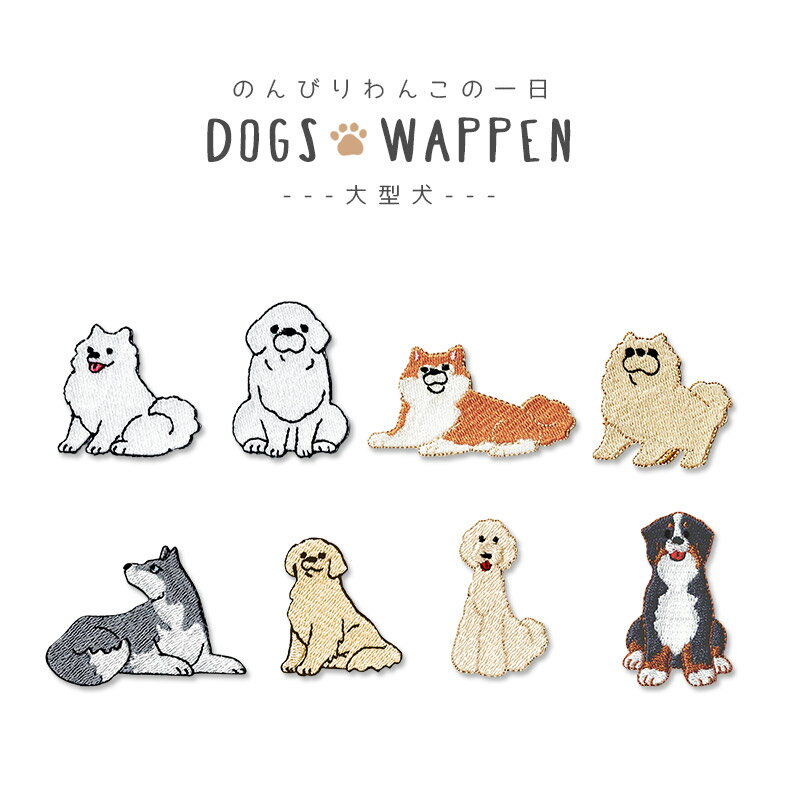 刺繍ワッペン のんびりわんこの一日 大型犬ワッペン 犬 いぬ 大型犬 サモエド グレートピレニーズ 秋田犬 チャウチャウ シベリアンハスキー ゴールデンレトリバー スタンダードプードル バーニーズ 総刺繍 アニマル 動物 かわいい アップリケ マスク アイロン接着