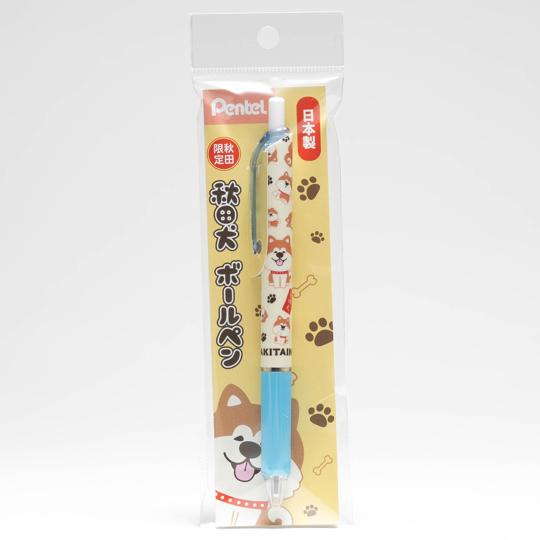 秋田犬柄の油性ボールペン。インクの色は「黒」です。 本体の色は「ブルー」です。 ■発売元:株式会社 フルゥール ■製造元:ぺんてる 株式会社 ■サイズ:長さ 約14.8cm 、幅 約1.2cm ■ボール径:0.7mm(黒)