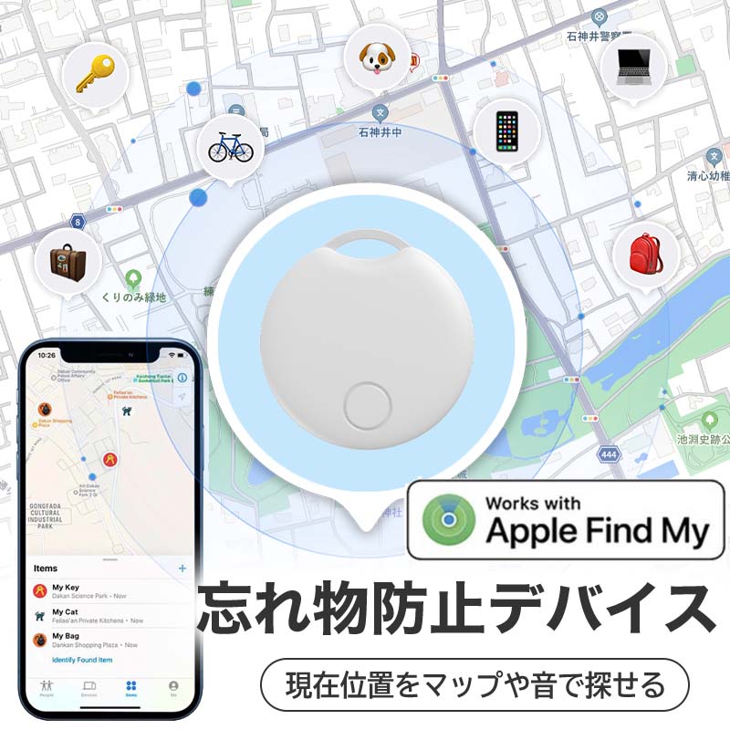 落とし物、探し物が多いiPhoneユーザー必見! 超コンパクトな約2.9cmのサーチタグが登場! サーチタグを付けた鍵や鞄を地図上に位置表示。 Apple「探す」アプリを使用して離れた場所から位置を探知できます。 車両の隙間にサッと入るので、愛車の盗難対策におすすめ! 地図上に位置表示 移動しても現在位置が更新されます。 ・盗難防止 ・忘れ物防止 ・盗難後の対策 ・落とし物対策 ・子供の位置確認 ・置き忘れ対策 ●車両の盗難対策に 車両の隙間にサッと入る ●紛失・盗難対策に 財布の小銭入れなどに ●迷子対策に ランドセルの隙間にも入る Apple社正規認証品 【サイズ(約)】 約W2.9×D2.9×H1.1cm(本体) 約W8×D3×H14.5cm(箱) ※サイズ違いによる返品、交換は承りかねますので、サイズをご確認の上ご購入ください。 【重量】 約7g(本体 テスト電池込) 約40g(箱込) 【電源】 CR2032 3Vリチウムボタン電池(テスト電池付き) 【主材質】 ABS、鉄、ポリエステル モニター発色具合によって実際のものと色が異なる場合があります。