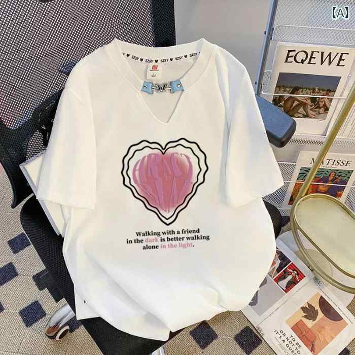 Tシャツ レディース Vネック 半袖 コットン 皮扣 150kg ゆったり 韓国風 プリント トップス カットソー