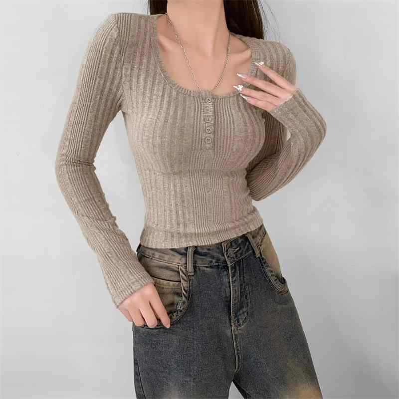 Tシャツ レディース 春物 長袖 トップス 大襟 スリム タイト 細見え プルオーバー インナー カットソー