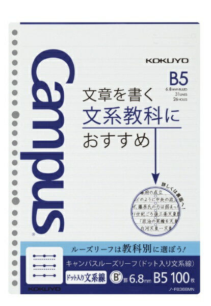 学習罫キャンパス ルーズリーフ ドット入り 文系線 6.8mm B5 100枚 6896 コクヨ 国語 社会 英語 余白あり罫 ノ-F836BMN