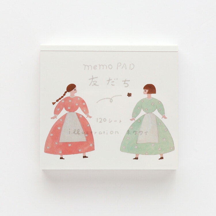 イラストレーターユニット・ネクタイの、ユーモアあふれるかわいいブロックメモ。 色違いのおそろいワンピースを着た なかよしの友だち。 本を読んだり、お出かけしたり、一緒に過ごすふたりがとってもかわいいです。 たっぷり120枚綴りなので、減るのを気にせずお使いいただけます。 またしっかりと厚みのある紙を使用しているため、裏移りしないのもポイント。 メモとしてだけでなく、プレゼントに添えるカードとしてもどうぞ。 ※メール便での発送は6冊までとなります。 サイズ 10cm×9cm 4柄 各30枚 120綴 PET樹脂表紙 ▶ステーショナリー 一覧を表示