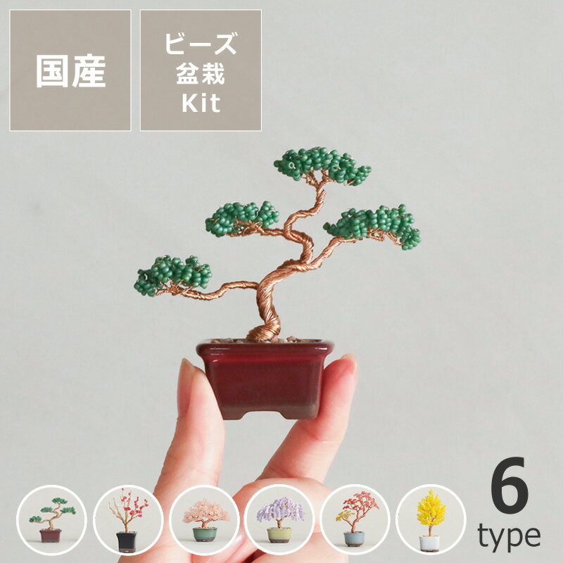 ★つまめるサイズの、ビーズ盆栽。 ビーズを通したワイヤーをねじって、小さな盆栽をつくるキット。枝や葉を自在に動かせるので、本物の盆栽のように好みの樹形に仕立てることができます。ねじったワイヤーの動きが、まるで本物の幹のよう。指先でつまめるサイズで、ずらりと並べて飾るのにもよさそうです。 ★ワイヤーに、ビーズを通してねじるだけ。 つくりかたは、ワイヤーにビーズを通してねじるだけ。土台となる鉢や砂利なども、すべてセットになっているため、ハサミとものさしがあればつくることができます。 ★材料はすべて、日本製。 MIYUKIのシードビーズをはじめ、材料はすべて日本製。ものづくり好きな方への、日本らしさのあるお土産としても、ぜひ。 ★四季を感じる、6つの樹種。 四季を感じる6種類の樹から選ぶことができます。 ■セット内容:ビーズ、ワイヤー、粘土、砂利、鉢、説明書 ■サイズ:タテ約6.5 〜9.5cm ×ヨコ約5〜7.5cm ■素材:ガラス、真鍮(または銅)、油粘土、石、陶器