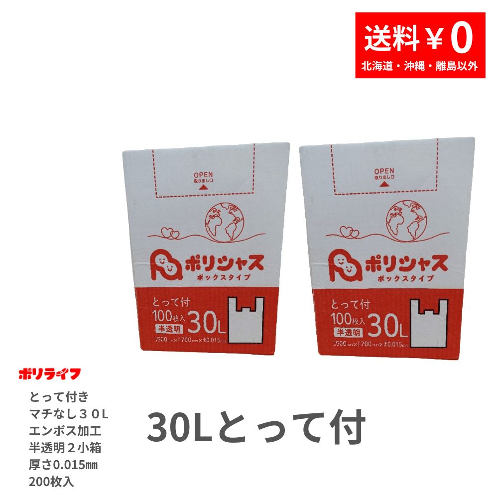 【ポイント3倍】【2小箱販売】ゴミ袋 30L とって付(マチ無 エンボス加工)半透明 200枚 箱タイプ 0.015mm厚 100枚×2小箱 1小箱あたり1050円 1枚10.5円 送料無料 HDPE素材 TBOX-330-2kb ポリライフ ポリシャス アンビシャス
