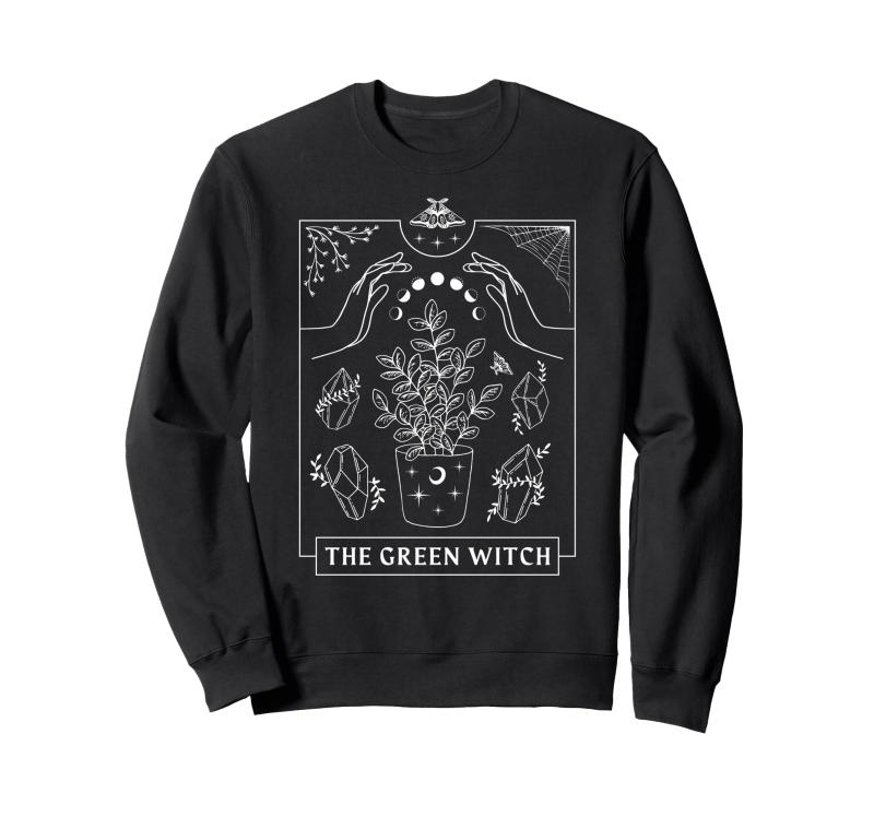 タロットカード 緑の魔女 - 植物愛好家 ガーデニング トレーナーガーデニング、観葉植物、多肉植物、薬草、薬草、魔法のポーション、緑の魔術が好きな魔女のための美しいスタイルの緑の魔女タロットカード。タロットカードタイプのヴィンテージイラストは、ウィッカ、魔女、庭の魔女、ハーブ愛好家へのユニークなクリスマス、ソリスティス、ホリデー、ハロウィーンのギフトアイデアになります。 かわいいルナの蛾、星、クリスタル、ムーンフェイズの絵が描かれています。
