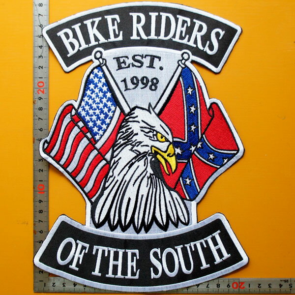 大きい刺繍アイロンワッペン アップリケ パッチ【BIKE RIDERS OF THE SOUTH・アメリカ南部のバイカー】バイク チョッパー アメリカン ハーレー イーグル 星条旗 アメリカ国旗 アメリカ南部の旗 アメカジ 革ジャン 革ベスト エンブレム Emblem Patch wappen 大人向け 背中