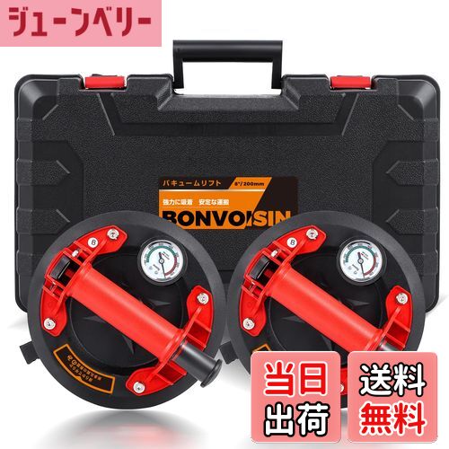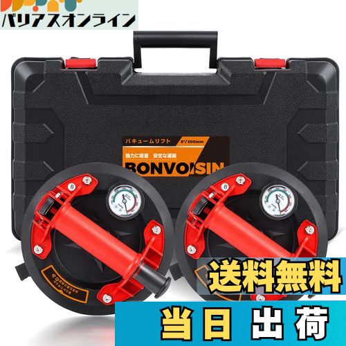 Bonvoisin バキュームリフター 2個セット 真空吸盤 サクションカップ 超強力 1個耐荷重110kg 200mm ガラス タイル 硝子 アルミ板 鉄板 マーブル 建材 荷物運搬 移動 収納ケース 日本語マニュアル1.広い接着面・高い耐荷重:このバキューリフターは8インチ(約200mm)あり、接着面が広いので操作する際に安定しやすいです。110kgまでの耐荷重が日常のリフト必要に応じます。2.3層のレバー・超強吸着力:この真空吸盤はラバーが3つのレイヤーで作られていますので、レバーが一層しかないものよりゴム盤が厚く、より強い吸着力を持っています。吸着部分のゴム盤は8mmと厚みがありますので、強力に対象物に吸着して脱落しにくいです。3.赤い線指示:使用中は、赤線が露出していないか常に監視することが重要です。赤線が表示されている場合は、内部の真空状態が動作基準を満たしていないことを示します。4.幅広い用途:このサクションカップは滑らかな平面に適用でき、滑らかな金属/石材/硝子に吸着させ移動等に使用できます。その他、取手のない棚や物など、滑らかな硬い平面を持つ家具などの移動にも適用します。5.2個セット:単品で買うより、2個セットの方がお得吸盤1個あたりの最大荷重110kg。もし素材が110kgを超える場合は、安全性を確保するために同時に2つの吸盤を使用してください。注意:生産ロットの差異より、製品に貼れたシールの仕様が異なる場合があります。