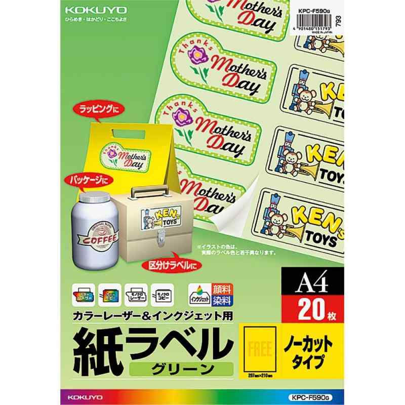 コクヨ プリンタ兼用 ラベルシール ノーカット 20枚 KPC-F590G【用紙寸法】 297×210mm【サイズ】 A4 【1片の大きさ】 297×210mm【面数】 ノーカット 【枚数】 20枚