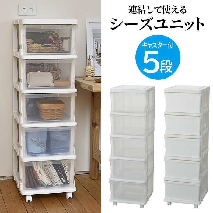 【5段】シーズユニット 日本製 収納ボックス キャスター付 国産 子供部屋 入学準備 入園準備 新生活 たんす タンス チェスト クローゼット リビング ホワイト クリア【メーカー直送】【252】/