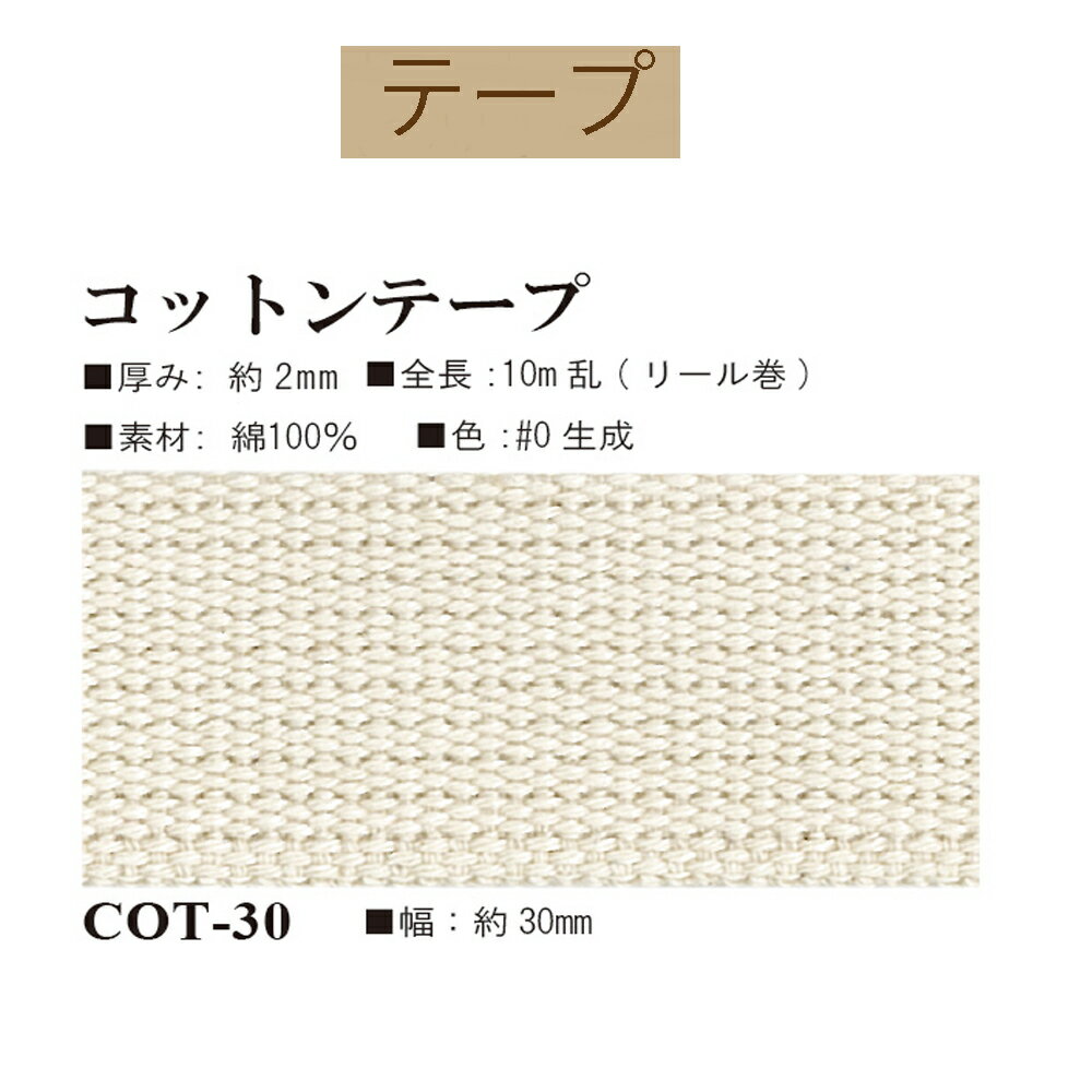 コットン100%のコットンテープです。 生成のみで1色10m単位1巻です。 サイズ:約30mm×10m乱巻 素材:コットン100% ※サイズ違いは品番が違います。 ※リール巻です。 ※価格は10メーターの価格です。 ※20mご注文の際は10m巻きが2反になりますのでご了承下さい。 ※この商品は10m巻きのみの販売になります。 ※メーターカットは致しておりませんので予めご了承下さい 。 幅約25mmのコットンテープはこちら 幅約20mmのコットンテープはこちら 幅約38mmのコットンテープはこちら ※ゆうパケットでの発送は出来ません