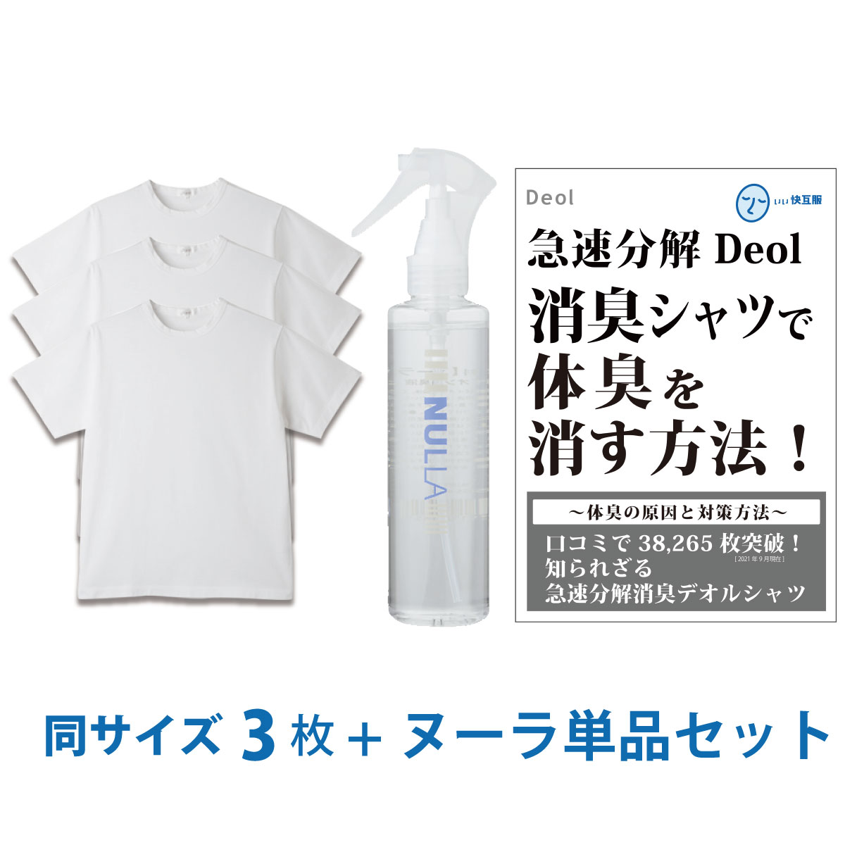【シャツ臭撃退セット】デオル クルーネックTシャツ 同サイズ3枚組+ヌーラ(単品)| ワキガ わきが わき臭 ワキ臭 消臭 対策 体臭 加齢臭 男性 メンズ インナー 肌着 綿100% 白 ホワイト 体臭 臭い 消し 臭わない 汗 まとめ買い tシャツ
