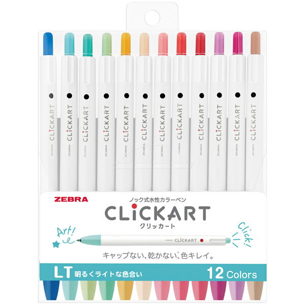 ノック式 カラーペン クリッカート 12色セット LT キャップがいらない ペン先が乾かない 水性カラーペン 明るくライトな色合い 明るい色 すぐ書ける 授業 子供 幼稚園 小学生 中学生 高校生 WYSS22-12CLT ゼブラ