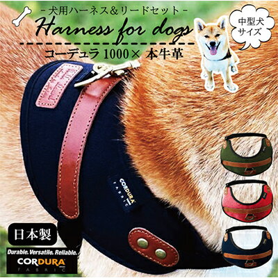 【ふるさと納税】【中型犬用】ハーネス コーデュラ×本牛革(黒×ブラウン革) 【雑貨・日用品・中型犬用・ハーネス・本牛革・本革・ペット用品・散歩用品】◇