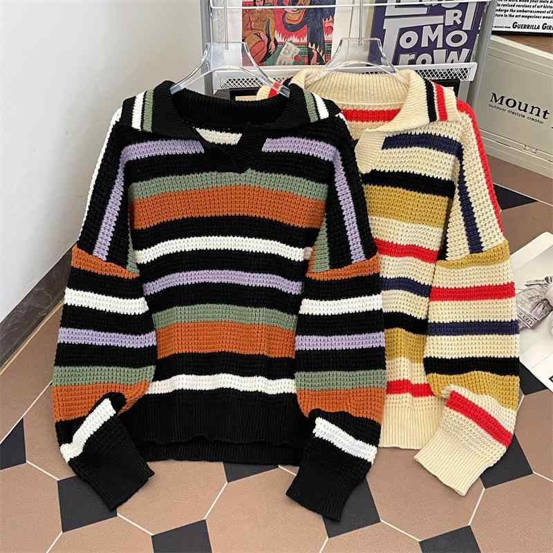 ニット メンズ 秋冬 tendances_mode_ tendance 折り襟 ジッパー ストライプ セーター おしゃれ polo襟 長袖 無地 4,795円