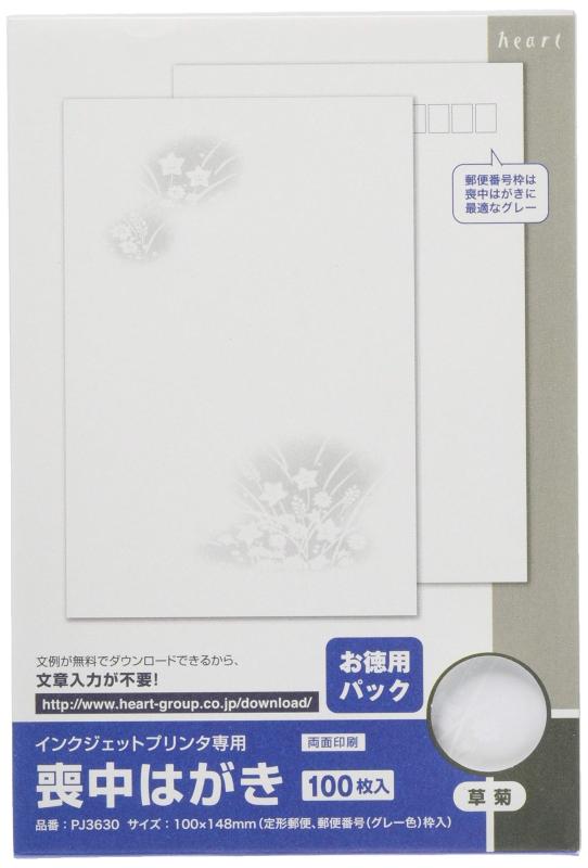 ハート インクジェット 草菊 喪中はがき(〒枠グレー)100枚Pインクジェット対応形状:カット用途:一般紙材質:普通紙枚数:100