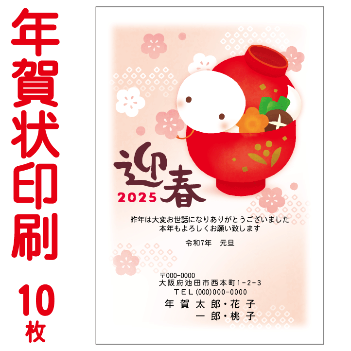 他のデザインはこちらからご覧ください ●レイアウト、印刷等は安心してお任せ下さい● ◎印刷はプロ向けのデジタルオンデマンド機(2400dpi)を使用します。 (住所等の小さな文字まできれいに印刷できますのでご安心下さい) ◎すべてオーダー品に付、受注後の変更、返品はできませんが、万一印刷間違い等、不備がありましたらお手数ですがご連絡下さい。 早急に対応させて頂きます。 【ご注文方法】 ●必要な項目を選択、印刷内容入力後「ご購入手続きへ」ボタンをクリックして下さい。 買い物かご画面に進みますので「ご購入手続き」ボタンをクリックして下さい。 送付先、お支払方法等をご確認後、注文を確定して下さい。 ※入力欄が足りない場合、その他ご要望事項がある場合は、注文確定前に備考欄に入力して下さい。 【ご注意とお願い】 ※購入代金のうち葉書代金相当額は、当社が郵便葉書を仕入れ時に立替払いしていたものをお客様にご請求するものです。 ●WEB上の印刷のイメージはモニターの種類や調整方法により実際とは多少異なりますのでご了承願います。 ●イメージした文字の大きさや色合いが違うといったクレームはご容赦願います。 【配送について】 ●10/31日迄にご予約頂いた年賀状の配送は11月上旬からとなります。 ●200枚まではゆうパケット、210枚以上はレターパック速達便(発送から到着まで1〜2日)にて配送いたします。 ※日時の指定はできませんのでご了承願います。 ●代引きご希望の場合、地域(北海道、沖縄、東北、離島)により普通郵便の代金引換便になる場合がございます。 手渡しで、時間指定不可ですが不在の場合再配達依頼すると日時の指定が可能です。 ●発送日より地域により1〜4日程度かかります。 ●お留守等でお受け取りになられず、保管期限が過ぎ当店に返送された商品を再発送する際は、発送方法、配送地域に応じた送料(例:ゆうパケット330円、レターパックライト370円、レターパックプラス520円…等)をご負担頂きますのでご了承下さい。 【書体について】 差出人部分の書体は指定がない場合、見本通りとなります。 【校正について】 ●原稿を「確認する」を選択された場合は、印刷原稿をご確認頂いております。 ※校了(原稿内容でOK)とのご連絡を頂いた後、印刷・発送致しますので、原稿に間違いがない場合も必ずご連絡よろしくお願いします。 ※原稿を「確認しない」を選択された場合は、印刷内容の入力ミス等にご注意下さい。 また、賀詞・副文・差出人部分等は一般的な配置に自動でレイアウトされます。 イメージしていた配置と違う等のクレームはご容赦願います。 ※レイアウトについてご希望がある場合は必ず、原稿を「確認する」をご選択下さい。 【キャンセルについて】 ●オーダー品につき印刷開始後のキャンセルはできませんのでご了承下さい。 ※印刷開始前であっても、お客様都合でのキャンセルの場合は1種類につき税込1,000円のキャンセル料が発生致しますのでご注意下さい。