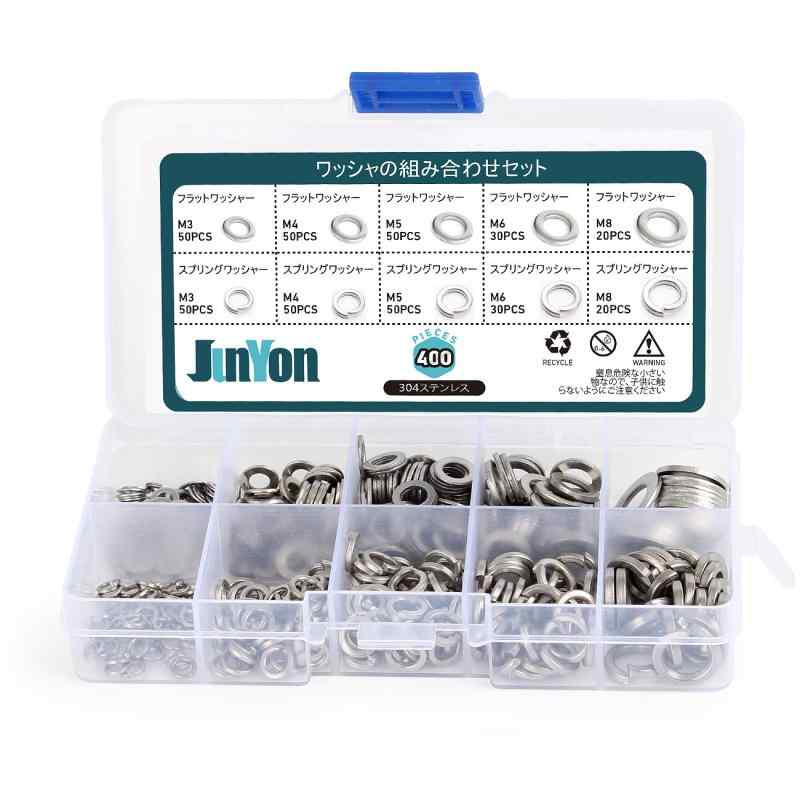 JUNYONスプリングワッシャー+フラットワッシャーセット ワッシャの組み合わせ M3-M8 400個セット DIY工作 修理 304ステンレス鋼