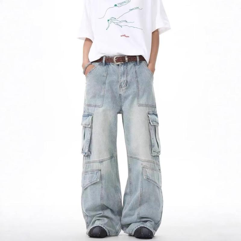 ジーンズ メンズ レディース 高街 デニムパンツ ワークパンツ 多ポケット ユーズド風 ストレートパンツ ウォッシュ加工