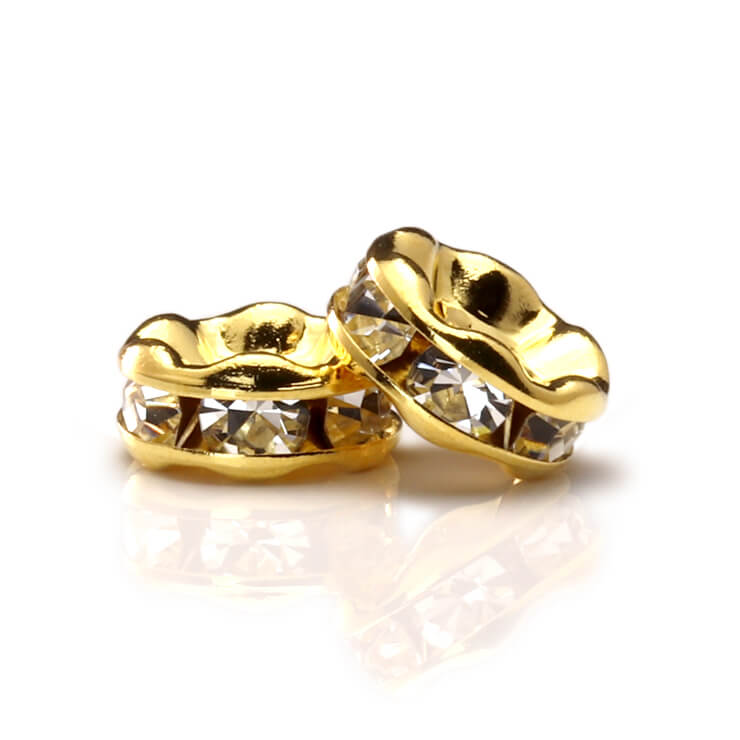 <波ロンデル 20カラー>パーツ バラ売り 直径6mm お洒落なウェーブタイプでカラーを20色から選べるゴージャスな雰囲気のロンデルです。 ラインストーンがキラキラと輝いて存在感抜群で、幅もありますので、ブレスレットの中にアクセントとして入れるだけでガラっと全体の雰囲気を変えてくれます。 素材 合金にメッキ加工 形状 波ロンデル 直径 約6mm(±0.5mm) 厚さ 約2.5mm(±0.5mm) 通し穴直径 約1mm程度 補足 ・水につけると変色する場合があります。 商品について ●お使いのモニターによって写真の色味がやや変わる点をご了承下さい。 >>>詳細はこちら