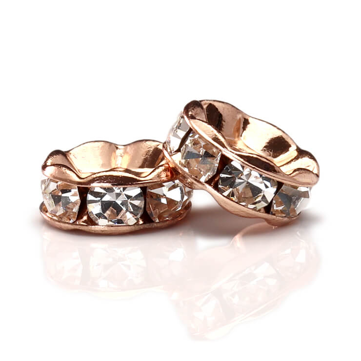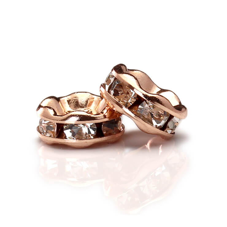Rondel Pinkロンデル 8mm(波型・ピンクゴールド)「ピンクゴールドカラー ロンデル」の8mmサイズのバラ売り販売です。こちらは「ビーズ加工技術の本場」ともいわれる「チェコ」で製造し、国内にてメッキコーティングを行った、上質な「ロンデル」を使用しております。一般的に流通しているロンデルパーツよりも、パーツ、メッキの耐久性が異なります。※塩水に一か月浸す実験でも、色の変化はありませんでした。ロンデル ピンクゴールド天然石パーツの引き立て役にピンクゴールドなので、ローズクォーツ、アクアマリン、翡翠などのストーンとの組み合わせに最適で、高級感を楽しめます。こちらはスタンダードな平型と違って、波型デザインなので、レディースデザイン向けです。sizeサイズ・品質についてロンデルは、メインストーンの左右等に使うことによって、大粒のストーンの美しさがさらに引き立ちます。8mmの大きさなので、10mmや12mmストーンとのバランスが良いです。製造はチェコ製なので他製品と比較してラインストーンの輝きが一段と綺麗です。そして特殊な製造方法により、ラインストーンが他製品と比較してしっかりと固定されている点も特徴です。表面のメッキコーティングも国内にて行っているため色合い・品質ともに安定しています。パーツサイズ:8.2〜8.4mm × 3.4〜3.5mm穴サイズ:2mm品質:色合いは均一で、個体差もほとんどありません。・こちらは1個からの販売となります。・撮影に照明を使用しています。・色合い・明るさはお手元の照明環境等によって異なって見える場合がございます。・可能な限り写真・掲載情報に近い在庫をご用意しておりますが、製造ロットによって多少の色差・サイズ差がございます。・ご利用のディスプレイによって色合いが若干異なります。Selected厳選された1つ1つのパーツパスクルの販売パーツは、3段階の厳しい基準による検品を経た、厳選品だけをご提供しております。
