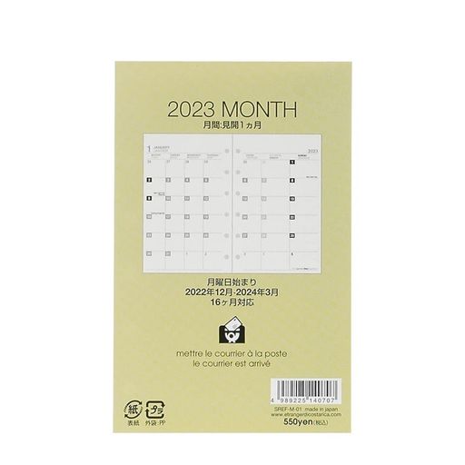 2022年12月~2024年3月 本文サイズ:95Wx170Hmm 160ページ カレンダー2年分、年計画:見開き6か月2年分、月計画:見開き1か月、週計画:見開き1週、1色印刷 日本製