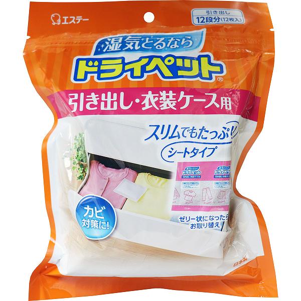 エステー ドライペット 引き出し・衣装ケース用 シートタイプ 12段分(12枚入) 殺虫剤 室内 洗剤 臭い 徳用 抽選 湿気対策 押し入れ 引き出し衣装ケース用 化学製品 吸湿乾燥剤 衣類 タンス 無香 湿気取り 悪臭 防虫剤 じめじめ 清掃 除湿 掃除