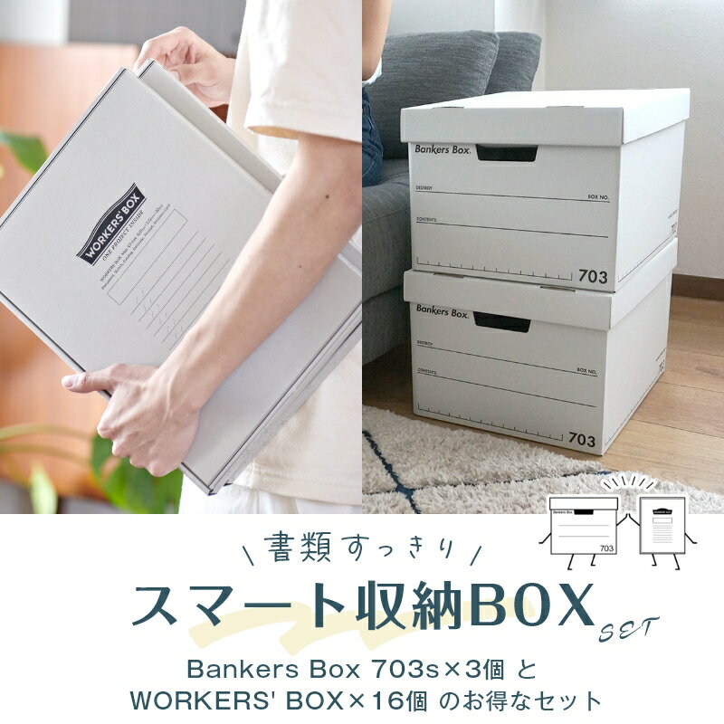 この商品のお支払い方法 お支払方法:銀行・カード・コンビニ・代引き 配送料金・お届け日 配送料金 配送料金:送料無料 ※沖縄、離島、一部地域は別途お見積りとなります。お問合せ下さい。 発送日・お届け日目安 ご入金確認後、お取り寄せのため2〜4営業日で発送いたします。 お見積り・購入前相談 smart-wbox-bbox-kl-r 見積もり・お問合せフォーム当店定番人気の収納ボックス「Bankers Box 703s」と「WORKERS' BOX」をお得なセットにしました。 BankersBOX 703sについて詳しく見る > WORKERS' BOXについて詳しく見る > 書類整理に最適なWORKERS' BOX16個は、BankersBOXにすっきり収まります。BankersBOX1個と、WORKERS' BOX16個は組み合わせてお使いいただくのがオススメです。 BankersBOX残りの2つは、そのまま収納BOXとしてお使いください。書類はもちろん、雑貨や衣類などの収納にもオススメです。 Bankers Box 703sには、WORKERS'BOX16個がぴったり入ります。 WORKERS’BOXは異なるサイズの紙や、付属品やパーツ等の紙以外のものもまとめて管理ができます。 ふた付きで中身が落ちないので、使い勝手もばっちりです。 バンカーズボックスに入れて管理すれば、見た目もすっきり。 年度ごとやジャンルごとなど、ぜひ合わせてご利用ください。 書類整理で使う場合、クリアファイルやプラスチックケースも用途が似ています。しかし、使い勝手が良いとは言えないものがほとんどでした。 WORKERS’BOXは異なるサイズの紙や、紙以外のものもまとめて管理ができて、ふた付きで中身も落ちず、コンパクトでスタイリッシュという、かゆい所に手が届く使い勝手の良さがあります。 滅多に使わないけれど捨てられない、家電の説明書や保証書の保管にもおすすめです。箱型なので書類の他にも予備のパーツや部品、コンセントやフィルター等も一緒に保管ができます。インデックスに購入日や保証期間を書いておくと、万が一のときに役立ちます。 学校や塾でもらう宿題やプリントも、教科別、塾別にまとめて保管できます。 机の上を整頓することで集中して学習する環境が整えられます。 旅先で取った写真や、映画のパンフレット、美術館やライブチケットの半券なども、WORKERS’BOXなら思い出毎に綺麗な状態でまとめて保管できます。 表紙に日付と場所を書いておけば、自分だけの特別な思い出ボックスの完成です。 お子様の描いた絵や作った工作物など、取っておきたいけど保管方法に困るものの収納にもWORKERS’BOXはぴったりです。 インデックスに日付やお子様の年齢を書いておけば、ごちゃごちゃしがちな工作物もすっきりまとまり、いつでも好きな時に見返せます。 旅行やイベントなど、行き先でもらったリーフレットやチケットの半券は、思い出として取っておく派です。サイズがバラバラの紙モノも散らばらず、簡単に、ちょうどよく収納できるWORKERS’BOXは、簡単なスクラップブックとして重宝しています。写真も、お気に入りをプリントして、一緒に保管すと見返したときに楽しいですよ。 私は、イベントごとにWORKERS’BOXに思い出をつめて、たくさんたまったら、BankersBOXに収納しています。16冊がシンデレラフィットするので、見た目もきれいだし、思い出も取り出しやすく、おすすめの組み合わせです。 お客様の声・エーワンについてお客様の声 その他の「お客様の声」を読む エーワンについて エーワンが支持される理由 当店の所在地・地図はコチラ