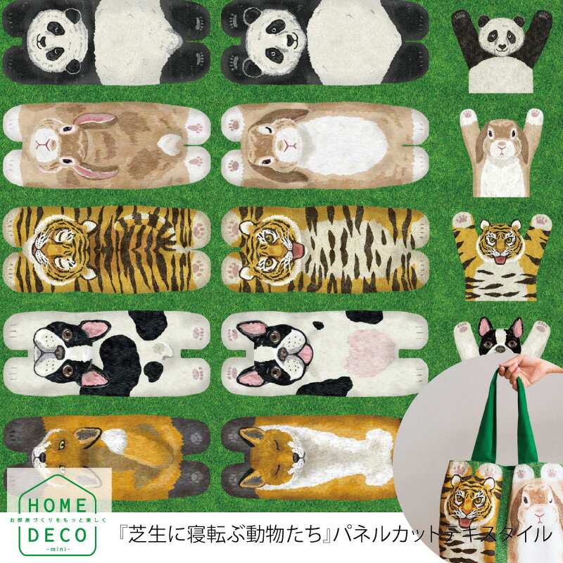 【メール便3個まで】HOME DECO アニマルパネル 芝生に寝転ぶ動物たち 約110cm×100cmパネルカット パネル単位販売 | 布 コットン シーチング 生地 ホームデコ マット ぬいぐるみ 動物 パンダ うさぎ トラ フレンチブルドッグ キツネ 雑貨 かわいい インテリア はぎれ