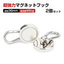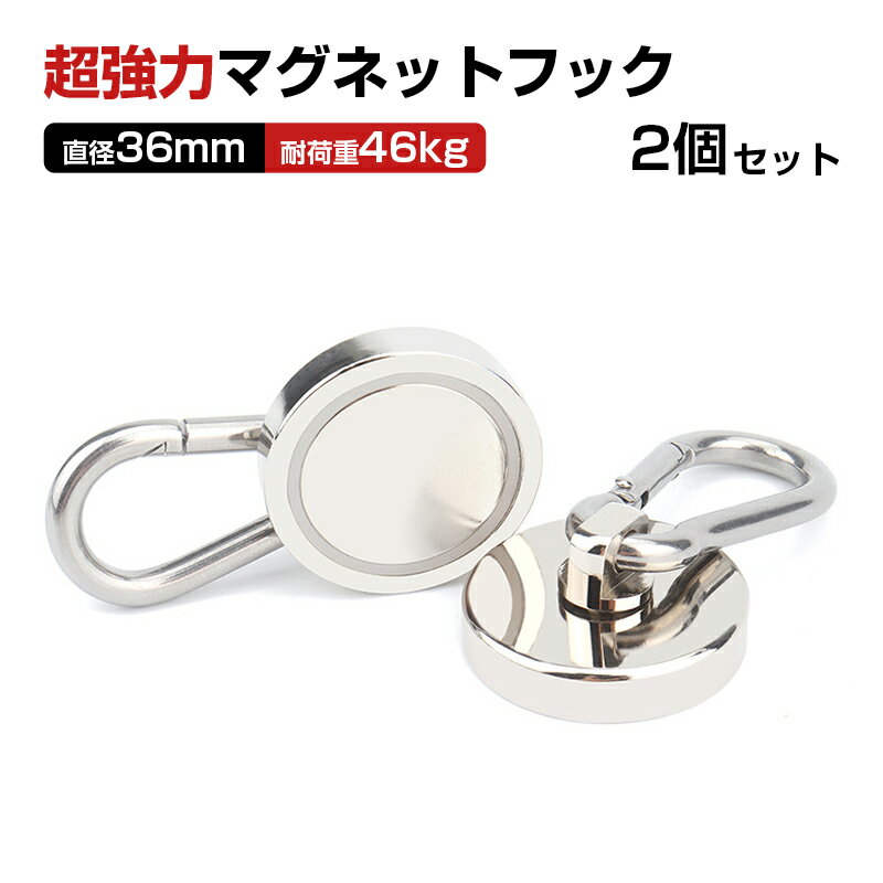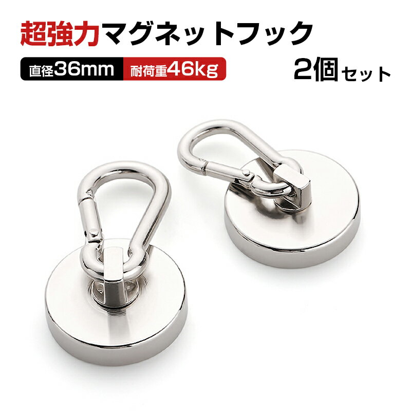 マグネットフック 2個セット カラビナ 強力 磁石 ネオジム 耐荷重 46kg 防錆 防水 壁掛け 収納 キャンプ タープ シェード アウトドア 冷蔵庫 倉庫 小型 直径36mm