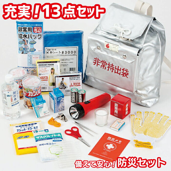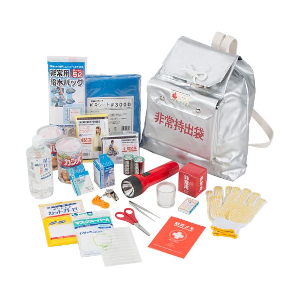 もしもの時の為に、必要なものをひとまとめにした緊急避難セット。 ■製品サイズ/(非常持出袋)約幅400×高さ405×厚さ(マチ)70mm ■箱サイズ/約305×225×240mm ■製品重量/約2,750g ■JAN/4969402042918 【セット内容】 ●非常持出袋(日本防炎協会認定品) ●懐中電灯(単一電池2本付) ●保存飲料水(500ml) ●缶入カンパン(100g)×2 ●非常用給水バッグ5L ●防寒・保温シート ●ポンチョ ●ブルーシート1.8×1.8m ●非常用ローソク(マッチ付) ●ホイッスル ●すべり止付軍手 ●救急セット(綿棒12本、カットガーゼ8枚、紙テープ10m、伸縮包帯、ガーゼマスク、ピンセット、ハサミ) ●防災メモ ご注意 防災セットのセット内容は、商品の入荷状況によって商品パッケージが違う場合や品質が同等の商品で代替対応させていただく場合がございます。予めご了承ください。ご注意 防災セットのセット内容は、商品の入荷状況によって商品パッケージが違う場合や品質が同等の商品で代替対応させていただく場合がございます。予めご了承ください。