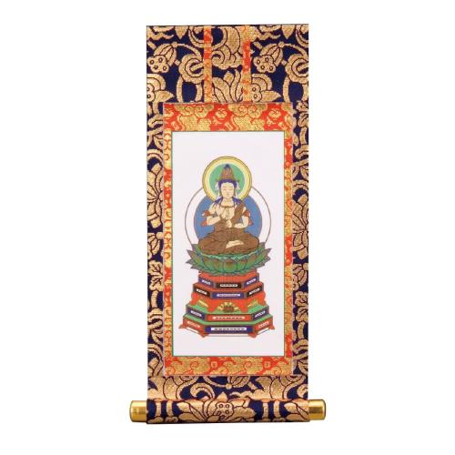 金糸デザイン浄土系諸宗派の本尊・阿弥陀如来(あみだにょらい)を上品に表現した掛け軸です。西方浄土に向かって立つ姿は、来迎印を結んで私たちを迎え摂めてくださいます。コンパクトな仏壇にぴったりのサイズ(です。 丁寧な仕上げ職人による細やかな技で仕上げた本格的な掛軸(かけじく)です。印相と相好を丁寧に表現し、慈悲に満ちた優しい表情が特徴。定期的なお手入れで長くお使いいただける丈夫な素材を使用しています。 扱いやすい設計小型の仏壇やミニ仏壇に合わせた使いやすいサイズ設計。軽い素材を使用しているので、女性やご高齢の方でもラクに掛け替えができます。紙とポリエステルを組み合わせた実用的な二層構造です。 伝統的な姿ご本尊(ごほんぞん)として相応しい、格調高い阿弥陀如来様の姿を表現。来迎印を結ばれた立像で、西方極楽浄土からの来迎を表現。お仏壇(おぶつだん)を荘厳に彩ります。 お手入れ方法柔らかい布で定期的に丁寧に拭いていただくことをおすすめします。しっかりとした芯材で型崩れを防止。毎日のお参り(おまいり)に使える実用的な作りです。