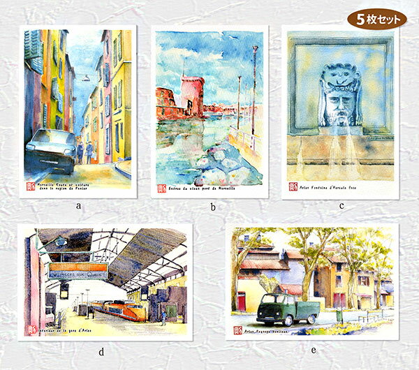 南フランス3 5枚セット ( プロヴァンス 街並 町 マルセイユ カーニバル アルル駅 トラック 水彩画 風景画) ★当店オリジナル★
