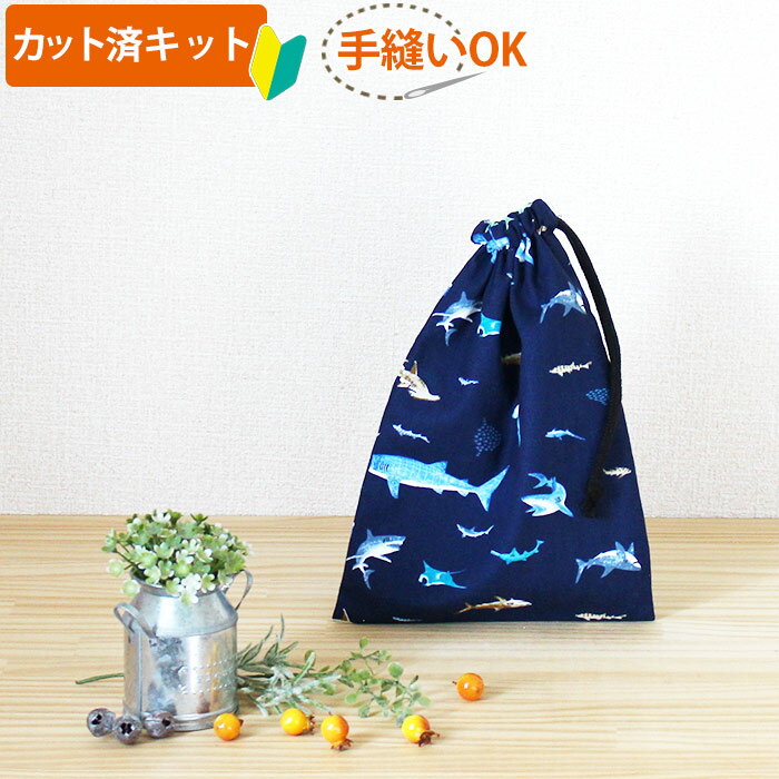 [カット済]サメのいる海【コップ袋】手作りキット 薄手生地+裏地 簡単 布 生地 袋物 コップ入れ 歯ブラシ 歯磨き 巾着小 作り方付き 初心者 手芸キット 手作り キット 入園 準備 保育園 テッテ