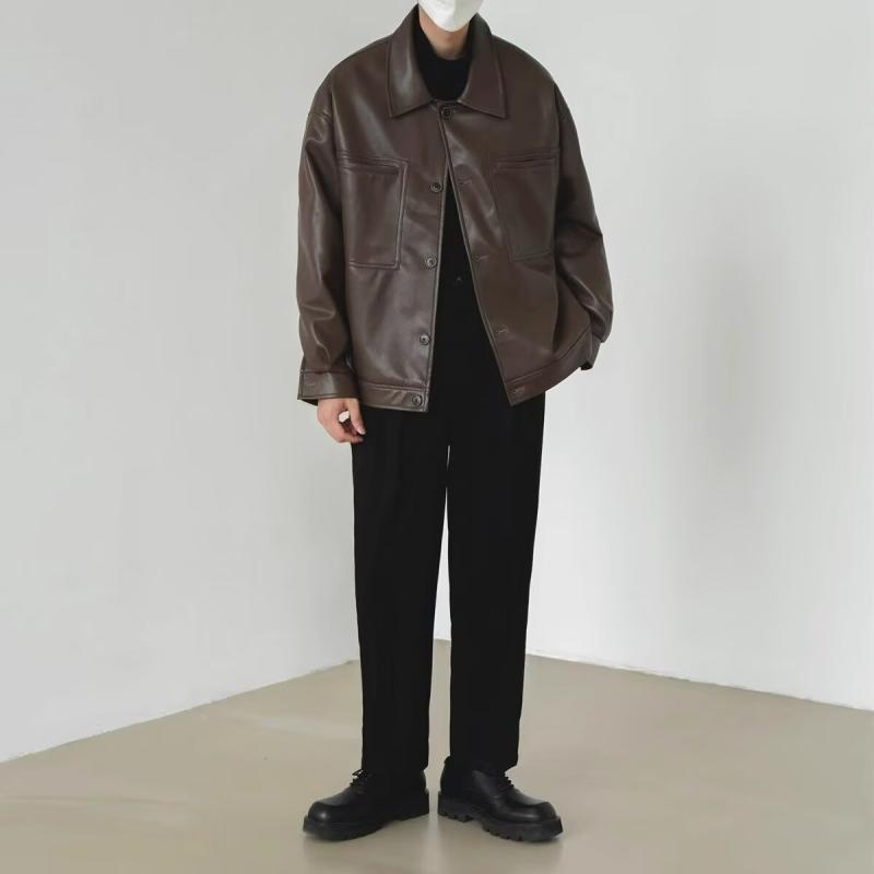 ["・カテゴリ: レザージャケット","・スタイル: カジュアル","・主な素材: PUレザー","・ネックライン: 襟付き","・前立て: ダブルボタン","・シルエット: ルーズフィット","・着丈: ミドル丈 (65cm〜80cm)","・カラー展開: ブラウン、ブラック","・サイズ展開: M、L、XL、XXL","・シーン: カジュアル","・対象性別: メンズ","・対象年齢: 大人"]