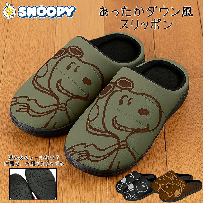 スヌーピー あったか ダウン風 スリッポン フリーサイズ 24.5cm キルティング スリッパ 溝あり 厚め ソール 内履き 外履き 前面大プリント 履き心地良い ツイル生地 SNOPPY PEANUTS