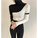 Tシャツ レディース ニット トップス 長袖 ハイネック 切り替え スリムフィット 配色 秋 冬 オフホワイト ブラック