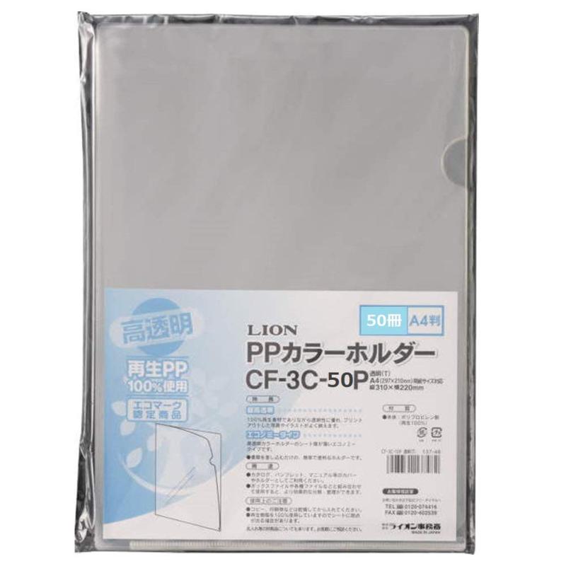 ライオン事務器 クリアホルダー PP A4 50冊 CF-3C-50P【規格】A4判【材質】高透明PPシート製(再生100%)・0.15mm厚【入数】50枚入【色】高透明