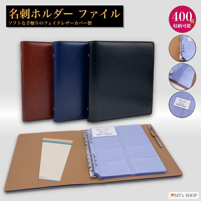商品情報 商品の説明 ビジネスシーンに適した高級感のある、大量の名刺の収納に便利なファイル型の名刺ホルダーです。見開き1ページで複数枚の名刺を閲覧でき、名刺の整理に便利です。 主な仕様 【カバー素材】:PUレザー(合成皮革)【カバーサイズ】:横26.5cm x 縦26cm x 厚み4cm ※折りたたみ時【リング仕様】:リング数6個、リング径 26mm【収納機能】:メモ用ポケット x1、ペンホルダー x1【クリアポケット素材】:半透明PVC【クリアポケット種類】:両面タイプ(片面 2列4段) (クリアポケット1枚で16カード収納可能)【ポケット数】:400カード 全50ページ(25枚)【ポケットサイズ(内寸)】:横9cm x 縦6cm【梱包内容】:名刺ホルダー本体、クリアポケット 25枚【総重量】:約870g (クリアポケット含む)※「MT's SHOP」は商標登録第6122480号により特許庁を通じ商標権(第35類)を取得しております。ビジネスシーンに適した高級感のある、大量の名刺の収納に便利なファイル型の名刺ホルダーです。見開き1ページで複数枚の名刺を閲覧でき、名刺の整理に便利です。名刺を受け取った順に整理したい方や、時系列で管理したい方に適しています。大切な顧客との取引が多いプロフェッショナルなビジネスパーソンに最適なアイテムです。カバーはフェイクレザー製で耐水性、耐摩耗性が高く、大切な名刺を守ります。持ち運びに便利なバインダー式の手帳型で、名刺を収納するクリアポケットは6穴タイプで差し替えが可能です。クリアポケットは両面タイプで、片面に8つずつポケットがついており、全25枚(400ポケット)が付属しています。また、厚手の丈夫な半透明のPVC素材はくっつきにくく、名刺の取り出しが容易なのが特徴です。 半透明のPVC素材はサラサラしているのでくっつかず、取り出しやすく、急ぎの場合にはサッと取り出せます。透明ポケットで表と裏両面から確認できるため、カードを探すのに便利です。ポケット内寸は 6cm ✕ 9cmで、一般的な名刺サイズなので、クレジットカードなどの各種カード、会員証、ポイントカードなど、分類して収納するのにも便利です。収納機能として、カバーの左側には、メモ用紙などを収納するポケットが1カ所、右側には便利なペンホルダーが搭載されています。【カバー素材】:PUレザー(合成皮革)【カバーサイズ】:横26.5cm x 縦26cm x 厚み4cm ※折りたたみ時【リング仕様】:リング数6個、リング径 26mm【収納機能】:メモ用ポケット x1、ペンホルダー x1【クリアポケット素材】:半透明PVC【クリアポケット種類】:両面タイプ(片面 2列4段) (クリアポケット1枚で16カード収納可能)【ポケット数】:400カード 全50ページ(25枚)【ポケットサイズ(内寸)】:横9cm x 縦6cm【梱包内容】:名刺ホルダー本体、クリアポケット 25枚(1枚で16カード収納可能)【総重量】:約870g (クリアポケット含む)※「MT's SHOP」は商標登録第6122480号により特許庁を通じ商標権(第35類)を取得しております。ブラック ブラウン ネイビー ▲楽天市場のポイントアップキャンペーン▲