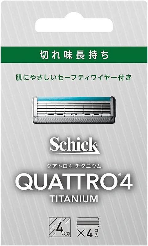Schick(シック) クアトロ4チタニウム 4枚刃 替刃(4コ入) セーフティワイヤー付 ドイツ製 シルバー 髭剃り カミソリチタニウム*、鋭い切れ味、長続き刃物の本場ドイツゾーリンゲン製しっかり剃れて錆びにくく切れ味長持ちセーフティーワイヤー付きで、横すべりを防止し肌を守るホホバオイル・アロエ・ビタミンE配合スムーザー